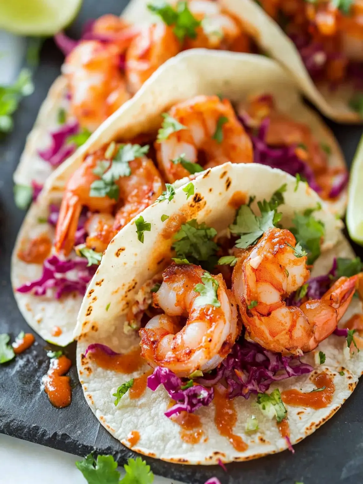 Crispy and Crunchy: The perfectly fried shrimp offer a delightful crunch, contrasting beautifully with the soft tortillas and fresh toppings.