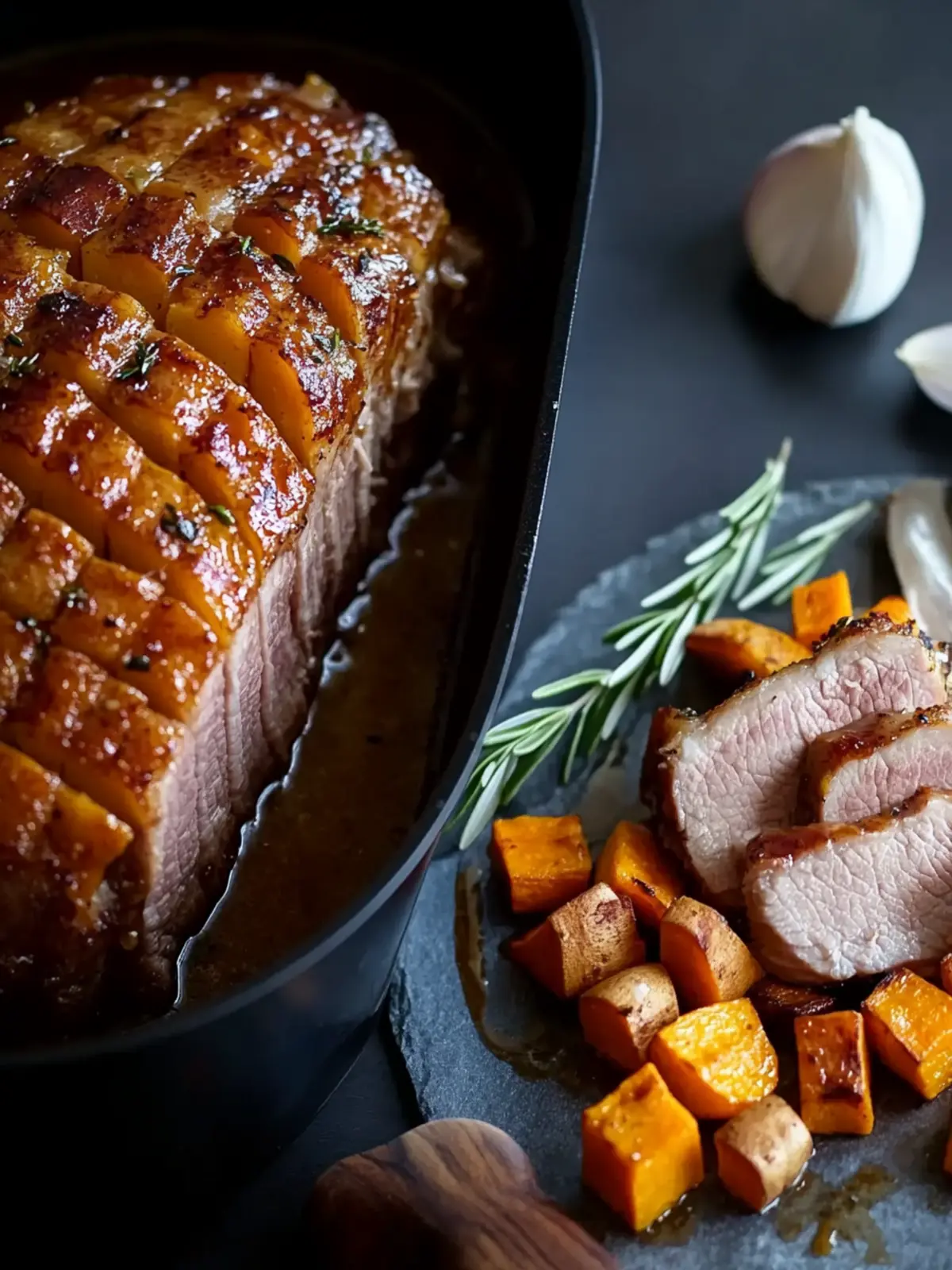 Place the pork in a deep roasting tray, skin side up, and roast for 1.5 hours. This allows the meat to become tender and juicy while developing a beautiful crust.