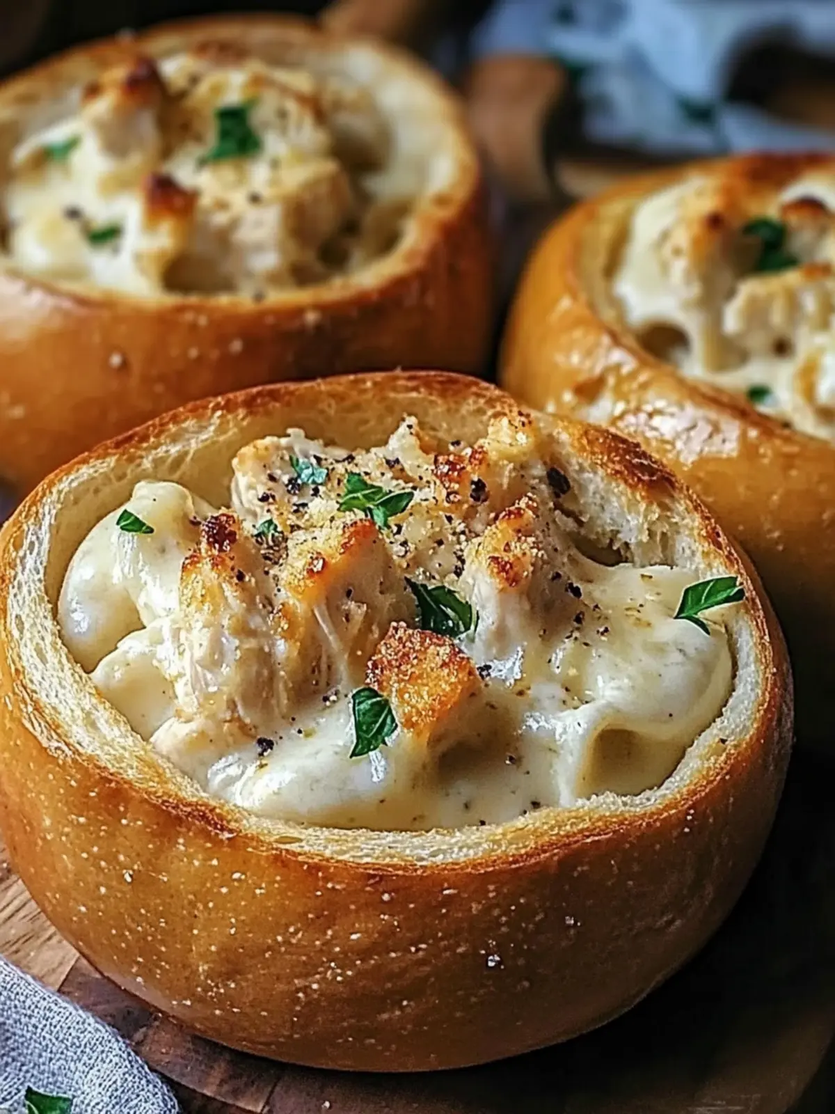 Comforting Warmth: These Chicken Alfredo Garlic Bread Bowls offer a delightful twist on two favorites: creamy Alfredo and crusty bread.