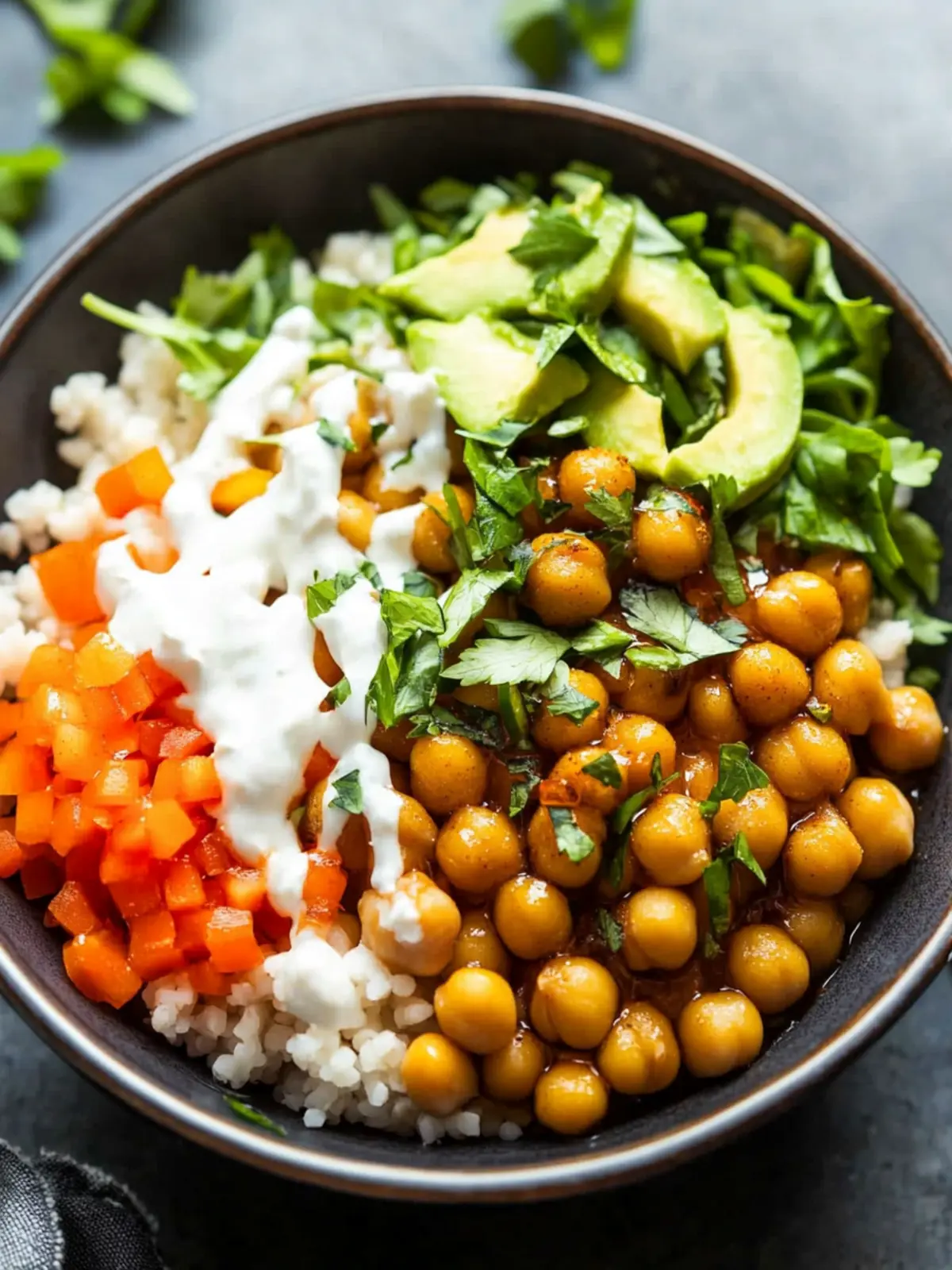 Nutrition shines through with protein-packed chickpeas and vibrant veggies.