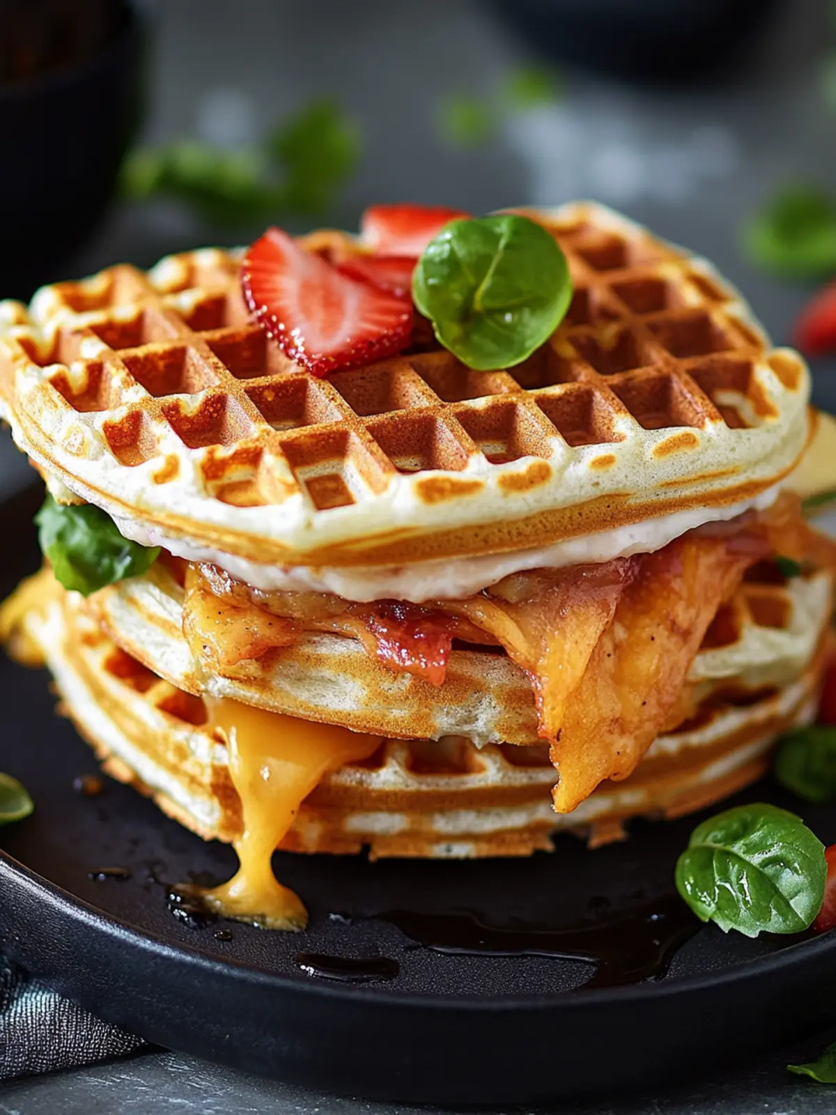 - Assemble Sandwich: Layer the scrambled egg, choice of meat, and cheese between two waffles.