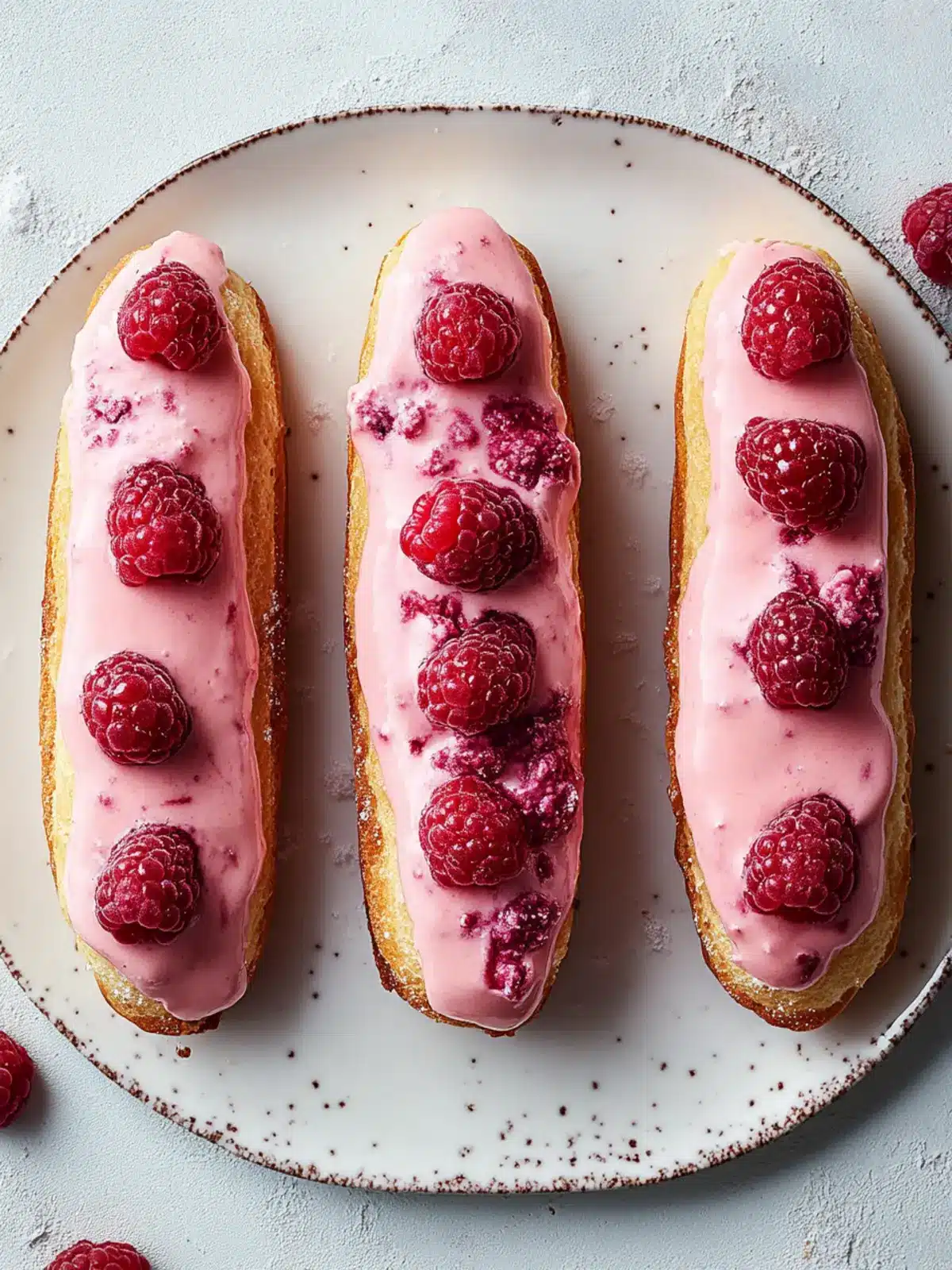 Visually stunning: The rich pink hue from raspberries makes these éclairs as beautiful as they are delicious, perfect for any gathering.