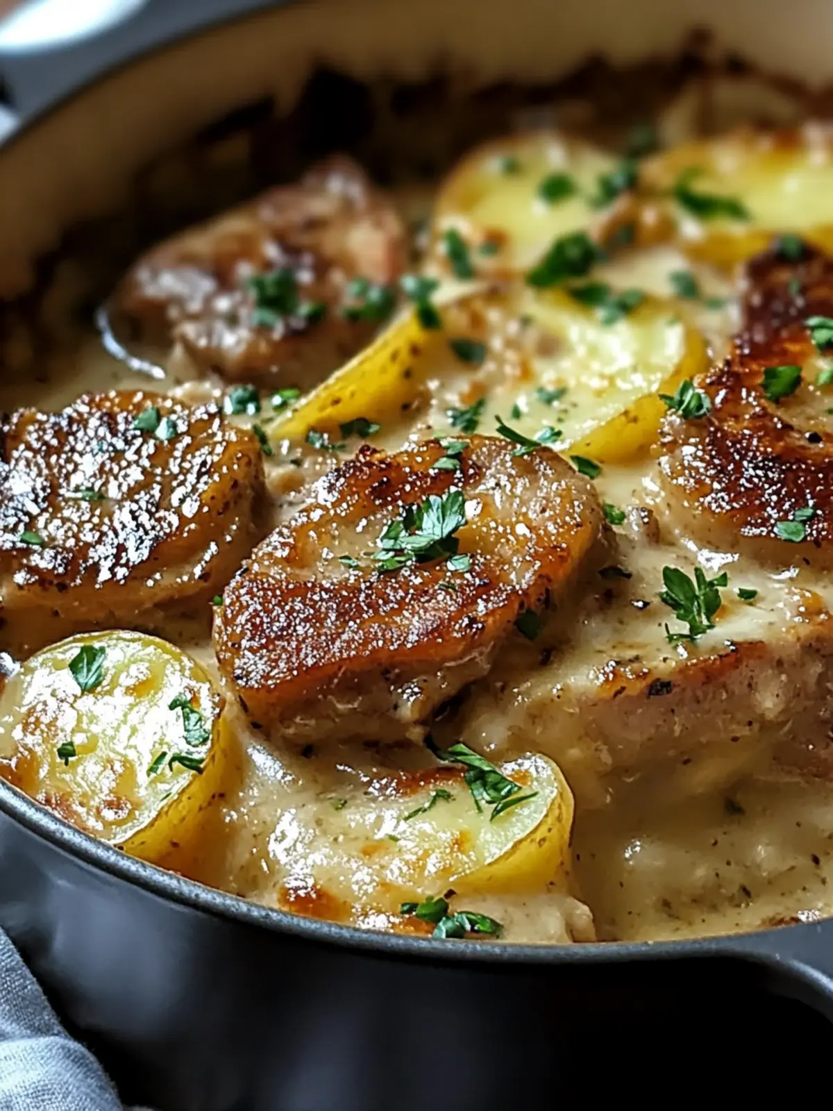 Comforting Flavors: This dish is a warm hug on a plate, blending juicy pork chops with creamy, cheesy potatoes.