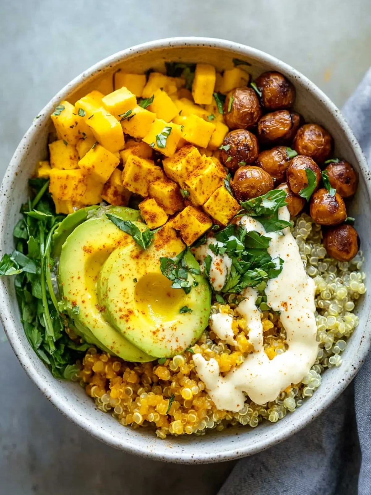 - Assemble bowls: Start with a base of quinoa, then layer on the roasted potatoes, chickpeas, and the massaged kale. Top with slices of avocado and a generous drizzle of dressing.