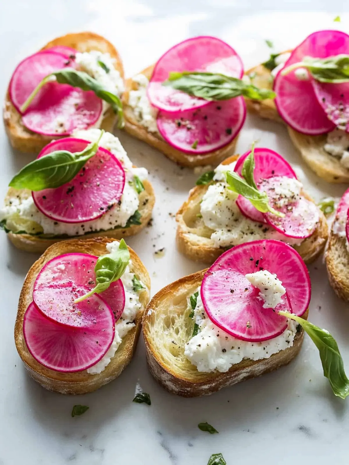 Very! To keep things fresh, store any leftover cheese spread in an airtight container in the fridge for up to 3 days. The watermelon radish slices can stay fresh for about a week if wrapped in a paper towel and placed in a closed bag. Keep the toasted baguette slices separate, ideally in a paper bag at room temperature for 1-2 days.